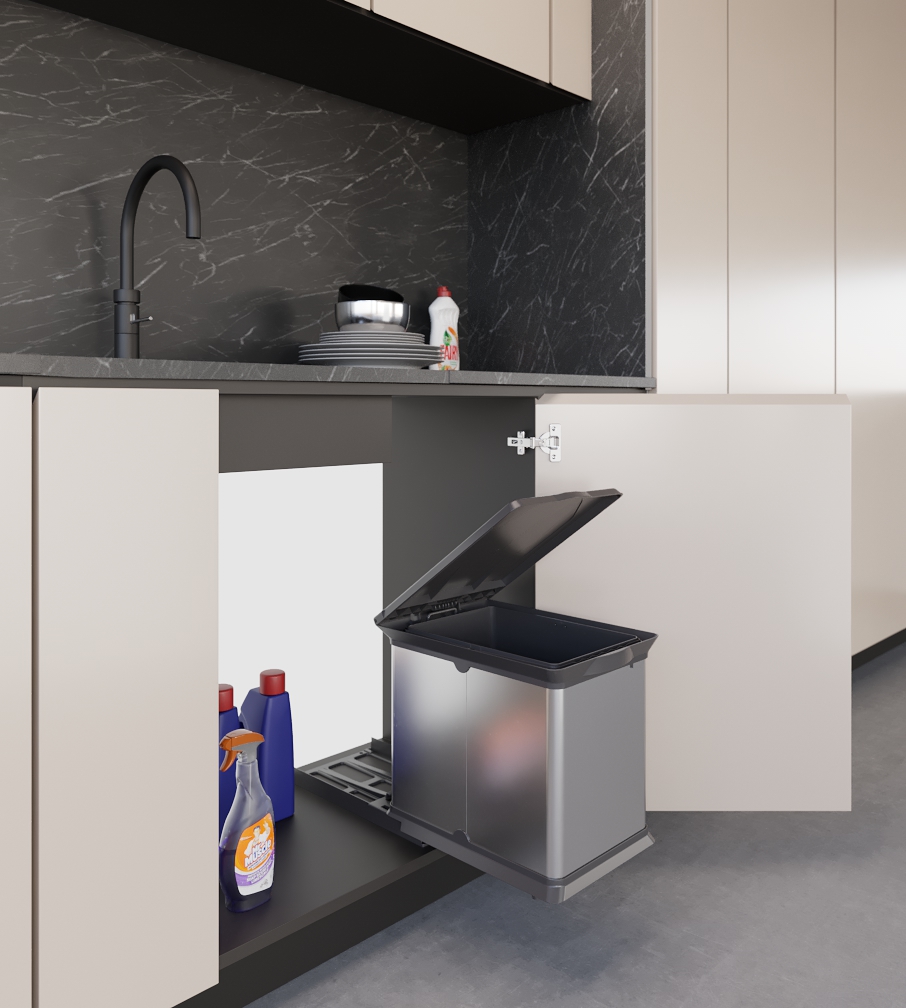 Extractable dustbin with steel covering plastic base and lid